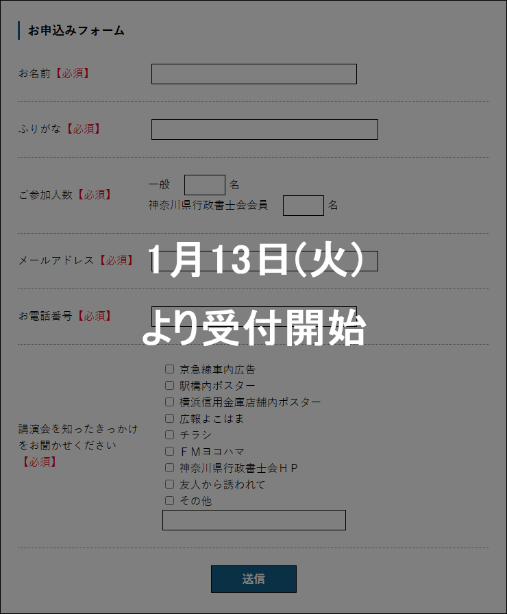 ※お申込みを頂いたあと5営業日を経過しても、ご連絡が無い場合は、恐れ入りますが神奈川県行政書士会事務局までご連絡ください。